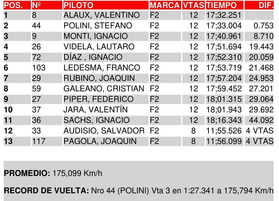 Es decir que si el chaqueño superaba a Valentino y se llevaba el triunfo, el campeón era Jara. Pero Alaux se aferró con temple al liderazgo y terminó superando por 0s753 a Polini, que sumó su 6º podio y concluyó como el piloto con más “top 3” del año. En tanto, Ignacio Monti (Aimar Motorsport) llegó 3º y logró su 4º podio de la temporada.