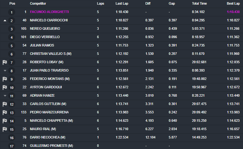 Y se trató de un ‘1-2’ para el Halcón Motorsport, con Marcelo Ciarrocchi (Ford Mondeo TR) en la segunda posición, a 40 centésimos de distancia en relación a su coimpañero de equipo. Nereo Queijeiro (Fiat Cronos TR) figuró tercero a 84 centésimos, mientras que los primeros cinco lugares se completaron con Diego Verriello (Fiat Cronos TR) y Julián Ramos (Lexus TR), a 93 centésimos y 1s323 respectivamente.