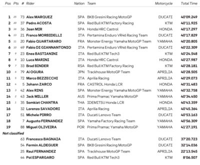 En cuarta colocación llegó el italiano Fabio Morbidelli, con 3 segundos de diferencia sobre Fabio Quartararo. Completaron el “top” 10: 6º Fabio Di Giannantonio, 7º Enea Bastianini, 8º Luca Marini, 9º Brad Binder y 10º Ai Ogura.