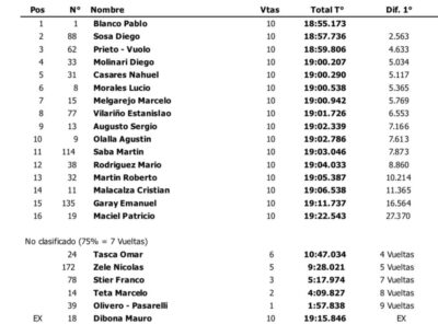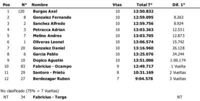 Mientras que en la Clase 2, no hubo grandes cambios. Pablo Blanco dominó sin problemas desde la largada y se llevó un triunfo fundamental que lo acerca al título. Le sacó casi 3 segundos a su máximo perseguidor Diego Sosa. De darse alguna serie de combinaciones, Blanco podría campeones hoy en la segunda final. Además, tercero terminó el binomio Prieto-Vuolo. Otro de los animadores del campeonato, Franco Stier, no pudo culminar la carrera.