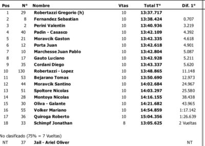 Mientras que en el TC1100, Gregorio Robertazzi confirmó lo que venía haciendo y se llevó el “1”, con una diferencia de 0.707 segundos por sobre Sebastián Fernández y de 3.219 con Valentín Perini. Este último quedó muy cerca de la consagración, y también podría lograrlo en la tarde.