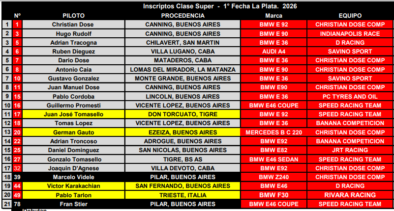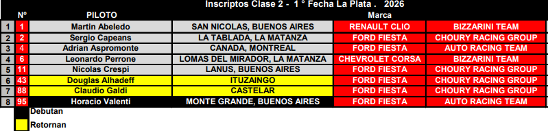 21 inscritos tendrá la divisional mayor, con los debuts de Marcelo Videle (BMW Z240) y Franco Stier (BMW E46). Por su parte, la menor tiene hasta el momento 8 anotados, con el estreno de Horacio Valenti (Ford Fiesta). Christian Dose y Martín Abeledo con Hugo Rudolf defenderán el título.