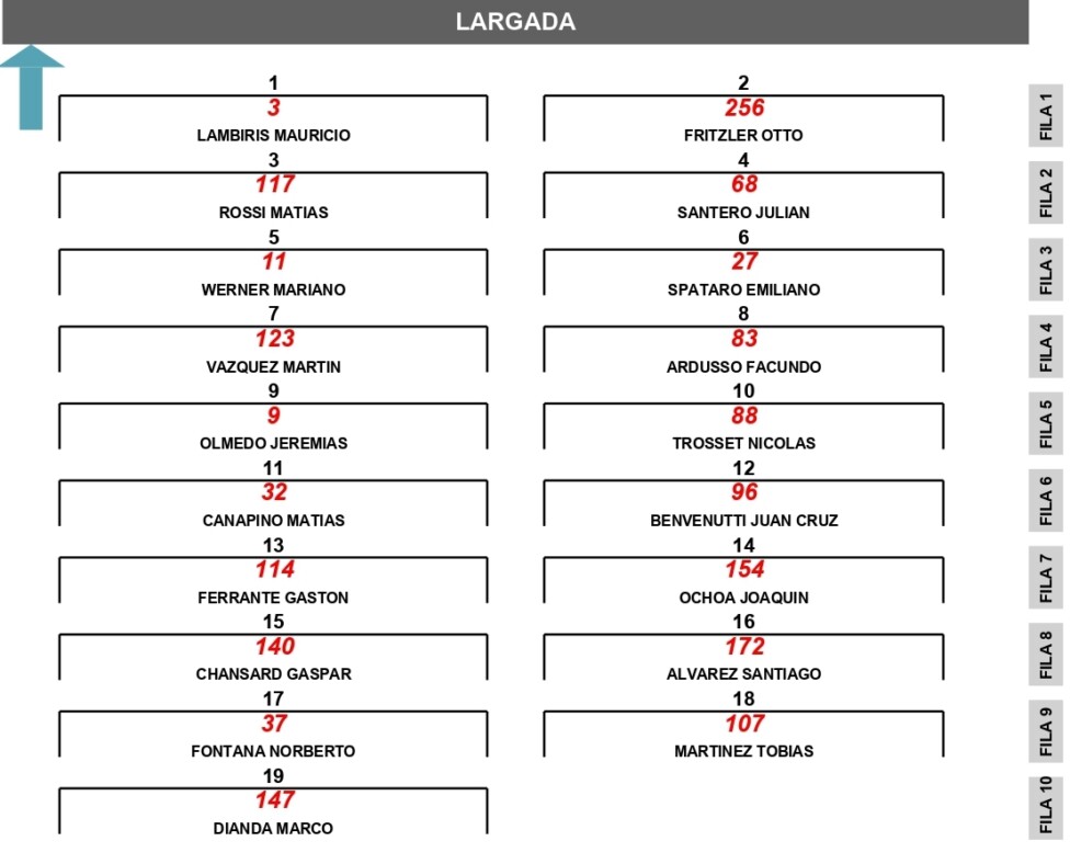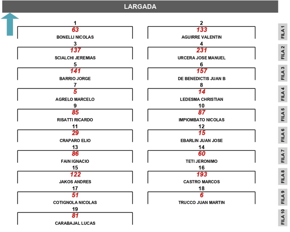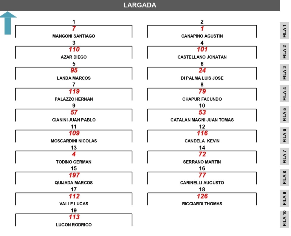 El tercer parcial, que se pondrá en marcha a las 11:45, tendrá al local Nicolás Bonelli (Ford Mustang) y Valentín Aguirre (Chevrolet Camaro) como integrantes de la 1ª fila. El entrerriano, que clasificó 4º, largará desde la primera posición por el recargo al “poleman” Marco Dianda (Dodge).
