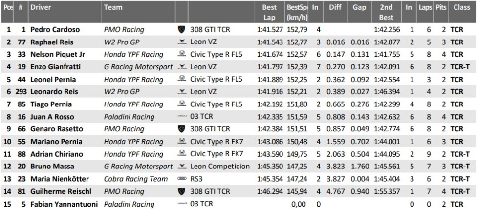 A ellos los siguieron Mariano Pernía (Honda), Adrián Chiriano (Honda), Bruno Massa (Cupra), María Nienkötter (Audi) y Guilherme Reischl (Peugeot) registrando tiempos, en tanto que no pudieron hacerlo Fabián Yannantuoni (Lynk&Co) y Fernando Croce (Honda).