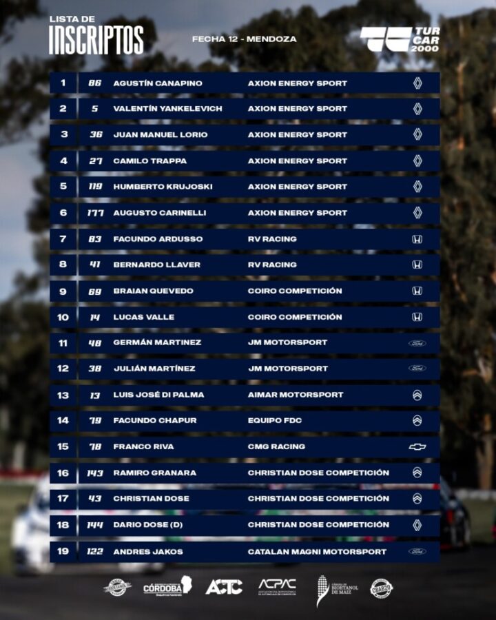 Con récord de inscriptos en lo que va del año, el Turismo Carretera 2000 llega al autódromo «Jorge Ángel Pena» de San Martín, Mendoza, para definir su primer campeonato, y cerrar así la temporada 2025. Serán 19 los protagonistas con el regreso de dos apellidos importantes, Di Palma y Chapur.
