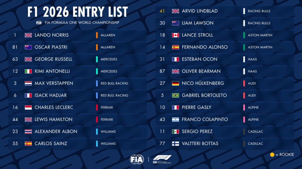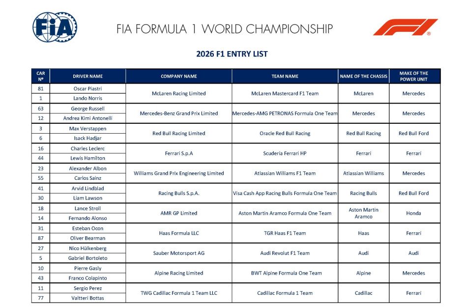 Como es habitual, la temporada 2026 también presentará cambios en las denominaciones oficiales de varios equipos, vinculados a acuerdos de patrocinio. La nómina publicada por la FIA confirmó además el ingreso de Cadillac como nuevo equipo y el regreso de dos pilotos experimentados: Sergio “Checo” Pérez y Valtteri Bottas, ausentes durante 2025. Ambos conservarán los dorsales que utilizaron a lo largo de sus carreras: el mexicano correrá con el 11 y el finlandés con el 77.