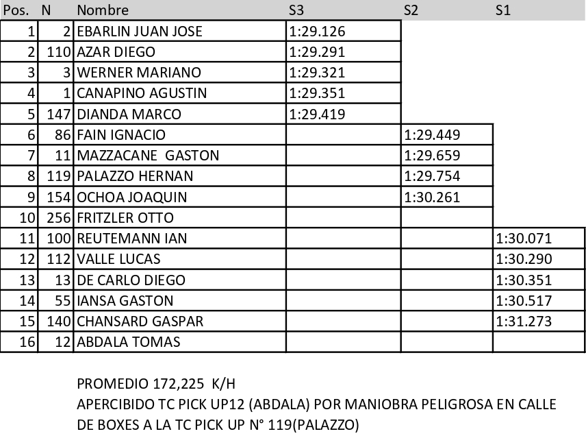 El representante de Benito Juárez, que afronta su 13ª participación en la categoría y viene de ser subcampeón en 2025, prevaleció en cada uno de los tres instancias que tiene la clasificación de TC Pick Up a partir de este año. En la primera, que eliminó a 6 pilotos, marcó 1m29s126; en la segunda, en la que quedaron afuera 5, registró 1m29s211 y en la tercera, donde se definió la “pole”, cronometró 1m29s151.