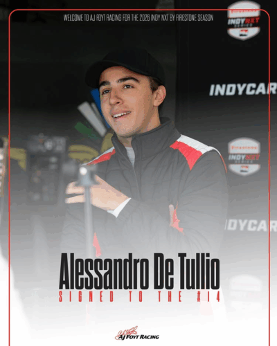 Alessandro De Tullio hará su debut dentro de la INDY NXT en la temporada 206 junto con el equipo AJ Foyt Racing. El piloto nacido en Miami fue confirmado como piloto titular luego de los test realizados el mes pasado en Indianápolis.