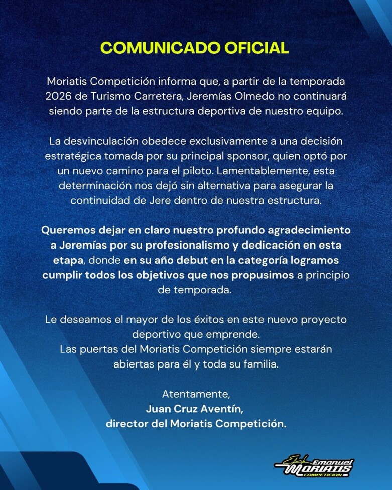 Jeremías Olmedo y el Moriatis Competición toman caminos separados para el 2026. Después de ingresar a la Copa de Oro con el Ford Mustang de la estructura, el piloto debutante en la máxima seguirá su carrera en otra escudería. Todo indica que el Canning Motorsports será el lugar de destino para el salteño, que ya tiene confirmada su participación en el TN con el equipo de Gustavo Lema.