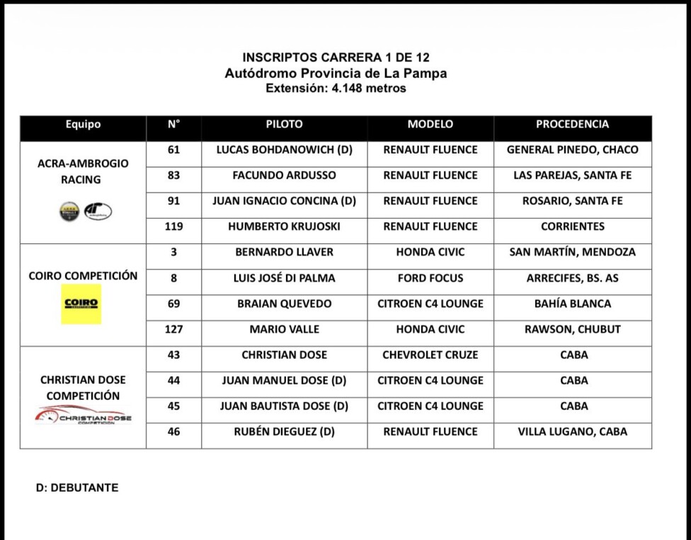 Además, serán 5 los pilotos debutantes entre los que se encuentran Lucas Bohdanowicz y Juan Ignacio Concina por parte de la escuadra de los Renault mientras que Juan Manuel Dose, Juan Bautista Dose y Rubén Diéguez lo harán por parte de la escuadra de Christian Dose.