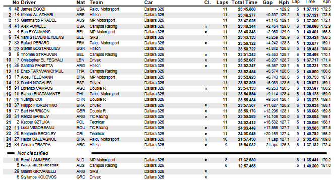 En tanto Giovanelli retornaba al box, la competencia tuvo un desarrollo intenso, y algunos giros lideró Gino Trappa (Hitech), hasta que tras un segundo relanzamiento fue superado por el americano Egozi (quien repitió el triunfo con Palou Motorsport) ante la rotura de un neumático que lo retrasó, debiendo ingresar a boxes para terminar 25° a dos vueltas; Santino Panetta, en tanto, fue 11° y Renzo Barbuy terminó 20°.