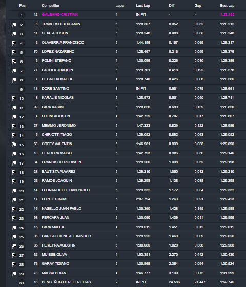 Francisco Olaverría se colocó 4.° a 0.157, continuando con el buen trabajo realizado en los entrenamientos matutinos. Nazareno López se acomodó 5.° a 0.216 y 6.° terminó Stefano Polini a 0.226, cerrando el «trencito» de pilotos encerrados en menos de tres décimas.