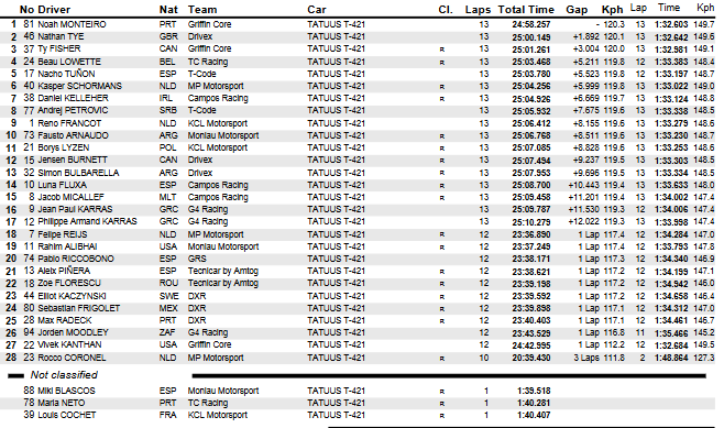 Un toque y enganche entre tres autos en la primera curva (Miki Blascos, María Neto y Louis Cochet) motivó una neutralización que demando una decena de giros para retirar a los autos del lugar; cuando se relanzó y produjo un despiste de Tuñón, quien se bajó sin inconvenientes de su coche el cual quedó ubicado en un lugar de riesgo para los participantes y esto motivó la finalización con bandera roja.