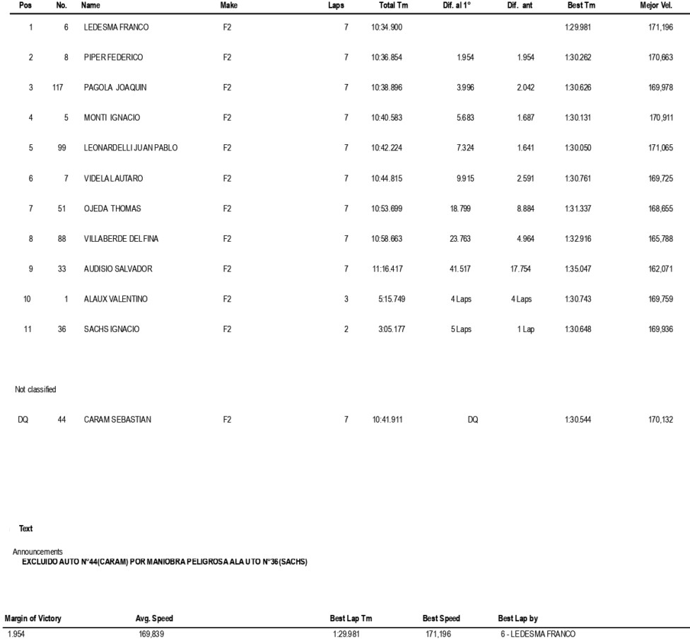 A partir de ahí, Ledesma comandó las acciones para lograr su 2ª victoria en Carreras Clasificatorias, ya que también había ganado la de El Villiucm 2025. Federico Piper (Werner Competición) terminó 2º a 1s954 del ganador, mientras que Joaquín Pagola (ESG Fórmula) completó el “top 3” luego de largar desde la 7ª posición.