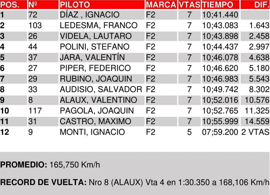 Franco Ledesma (Gabriel Werner Competición) terminó en el 2º puesto por tercera Carrera Clasificatoria consecutiva y Lautaro Videla (LR Team) repitió el 3º lugar que venía de obtener en la Final de San Nicolás.