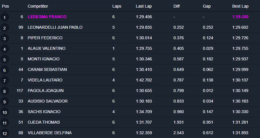 Ignacio Monti, que dejó el Aimar Motorsport y se sumó al ESG Fórmula a partir de esta 3ª fecha, fue “el mejor del resto”, a 0s587. Por su parte, Lautaro Videla (Mauro Martínez Competición), ganador de las dos Finales de la temporada 2026 y líder del campeonato, clasificó 7º a 0s787, aunque largará 12º en la Carrera Clasificatoria a raíz del recargo por cambio de motor.