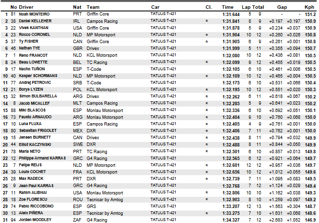 Con respecto a Fausto Arnaudo (Monlau Motorsport), quien hace su presentación en esta ronda de Winter Series, clasificó 16° al registrar 1m32s404, y ordenarse a 761/1000 del poleman.