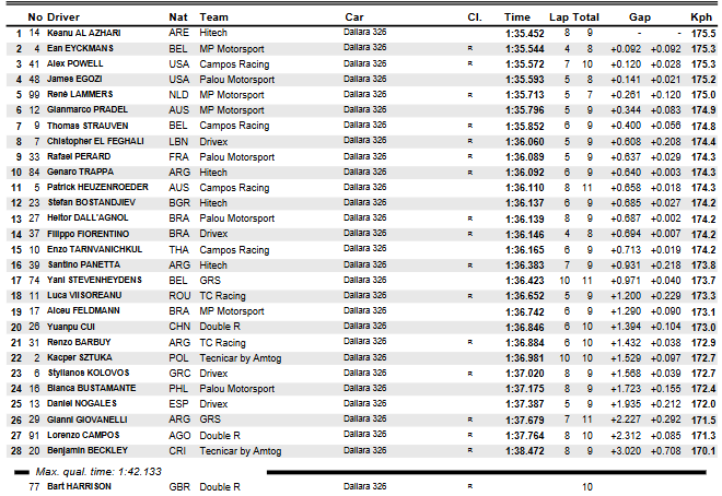 Además del piloto de Villa Devoto, también clasificaron los restantes participantes argentinos: 10° quedó Gino Trappa (Hitech), 16° fue Santino Panetta (Hitech) y 21° Renzo Barbuy (TC Racing).