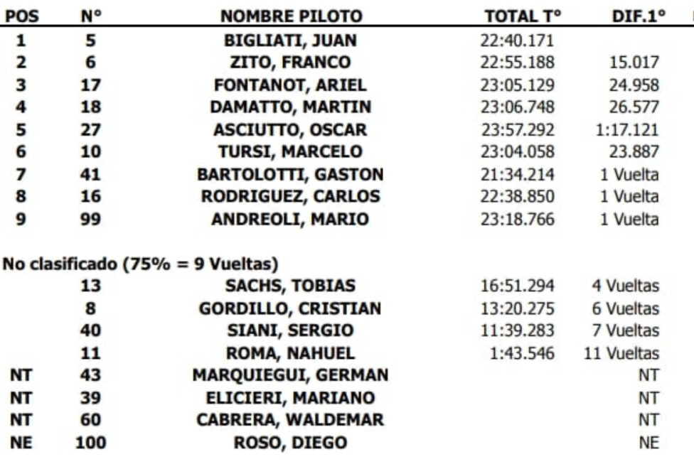 Final del día sábado en el TC Regional, y en la Clase GTA Juan Bigliati se adjudicó una gran victoria con mucha diferencia y contundencia que lo mete de lleno en la lucha por el título. Segundo fue Franco Zito, en una carrera con muchos condimentos. El podio lo completó Ariel Fontanot, que avanzó diez puestos en relación a la largada. El “poleman” Tobías Sachs, debió abandonar en la cuarta vuelta, suerte que también corrió el puntero Cristian Gordillo, tras seis giros.
