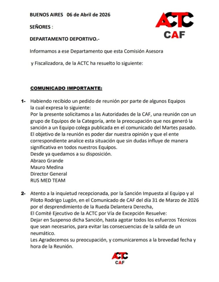 Además, el comunicado aclara que equipos de la categoría solicitaron una reunión para rever el tema, con la firma de Mauro Medina, director del RUS Med Team. En brevedad se comunicará la fecha de la misma.