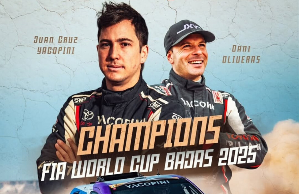 Juan Cruz Yacopini llegó a la Qatar International Baja con chances de asegurar la diferencia de puntos que le permita quedarse con la Copa Mundial de Bajas de la FIA. Al terminar la carrera, a la que llegó con la camiseta de Diego Maradona, celebró el resultado dentro de la categoría máxima de potencia (Ultimate T1+) con su Toyota Hilux y se consagró junto al navegante español Dani Oliveras.