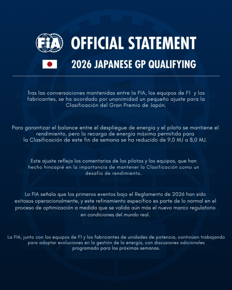 En la previa del Gran Premio de Japón 2026, la FIA emitió un comunicado en el que confirmó una modificación en los parámetros de gestión de energía para la sesión de clasificación. La decisión se tomó en conjunto, tras conversaciones con los equipos y fabricantes de unidades de potencia, el objetivo es preservar la competitividad.