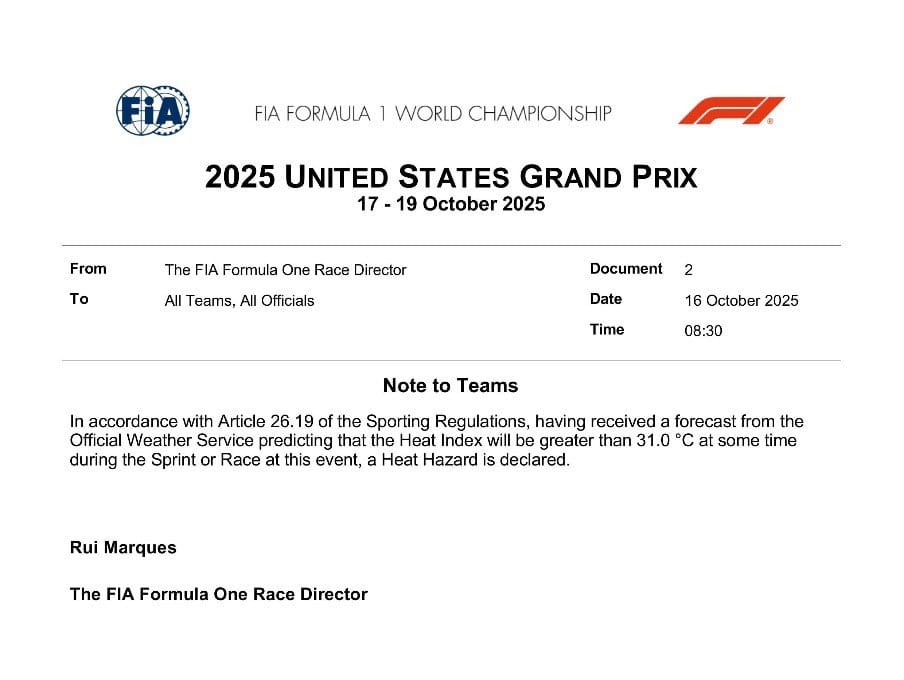 Las temperaturas en el Circuito de las Américas superarán los 31°C, por esta razón la FIA comunicó que se activa el protocolo por riesgo de calor durante las actividades en Austin. Según el comunicado la decisión se tomó en base al Artículo 26.19 del Reglamento Deportivo.