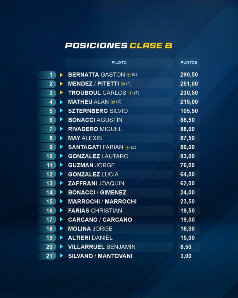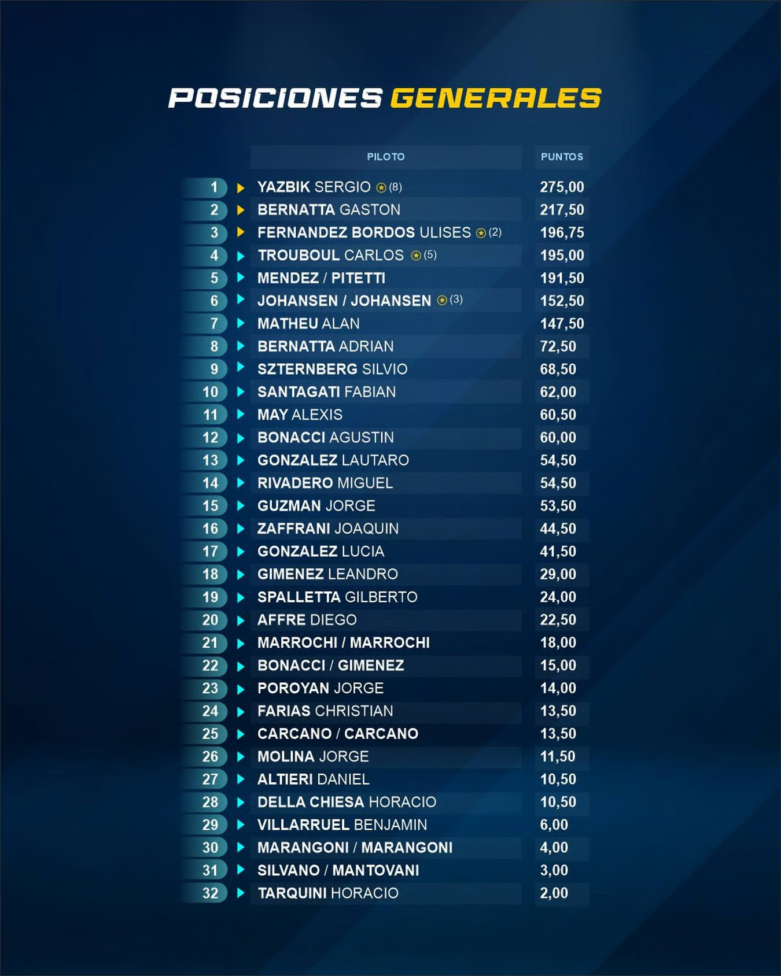 Sergio Yazbik fue campeón a falta de una carrera: terminó el campeonato con una amplia ventaja de más de cincuenta unidades en la tabla general. Mientras que en la Clase B, Gastón Bernattá también se alzó con la corona de manera anticipada y superó por casi cuarenta puntos al binomio Mendez-Pitetti.