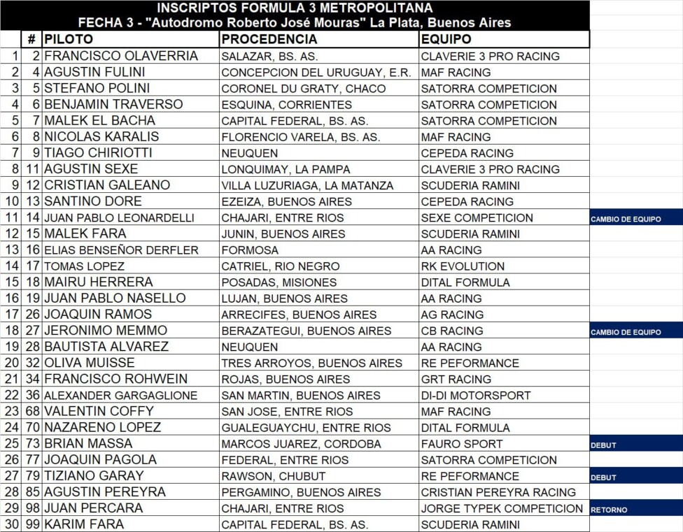 Para esta jornada, tendrá 30 pilotos compitiendo arriba de los monoplazas, con dos debuts y un retorno. Brian Massa hará su primera aparición, con el equipo Fauro Sport y Tiziano Garay estará con el RE Performance. Mientras que Juan Percara vuelve en el Jorge Typek Competición. Además, Jerónimo Memmo se suma al CB Racing y Juan Pablo Leonardelli al Sexe Competición.