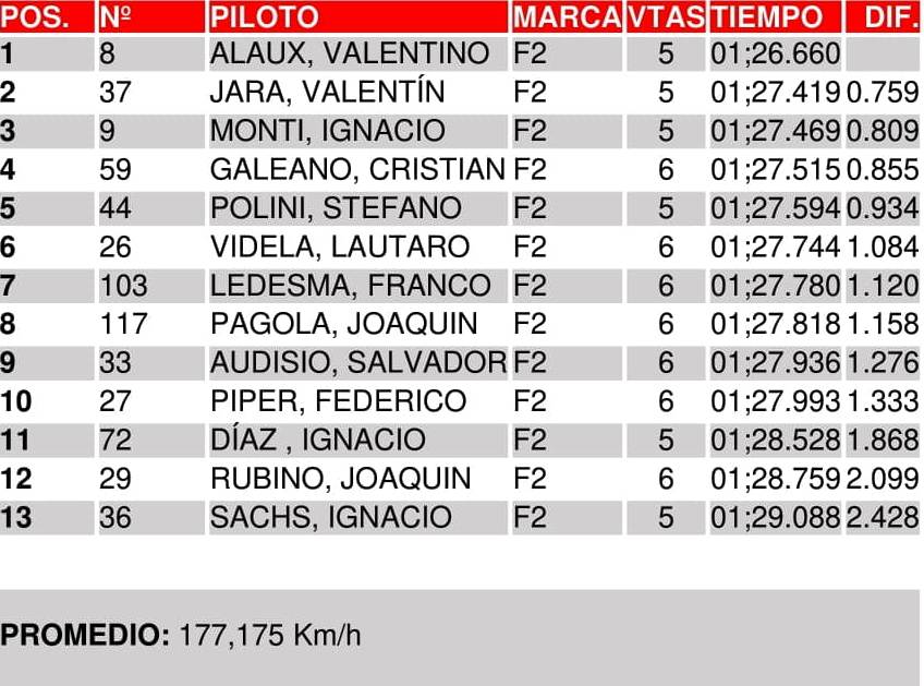 Valentín Jara (Mauro Martínez Competición) es el principal rival de Alaux en la lucha por el título: está a 18,5 puntos, pero a diferencia del bonaerense ya tiene el triunfo necesario. El neuquino clasificó 2º a 0s759. Ignacio Díaz (LR Team), el tercer candidato a 46 puntos con 55,5 en disputa, quedó lejos: 11º a 1s868.