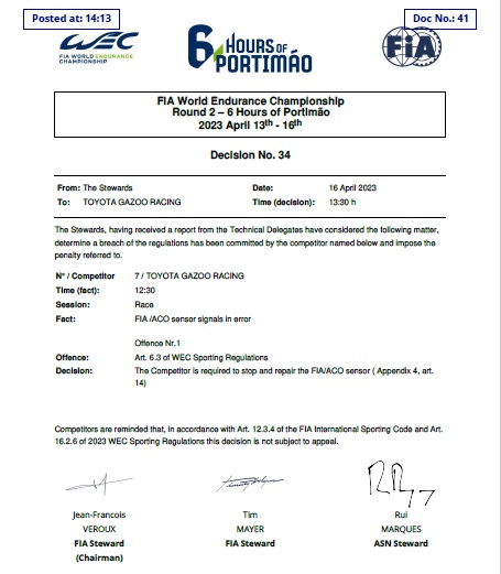 Al cumplirse 1h20m de las 6 horas de Portimao, segunda ronda del Campeonato Mundial de Resistencia, el Toyota GR010 N°7, conducido hasta allí por Mike Conway, fue llamado a los boxes para realizar una inesperada reparación en uno de sus componentes, ante la advertencia de las autoridades de la carrera que no registraban algunos datos telemétricos de la unidad.