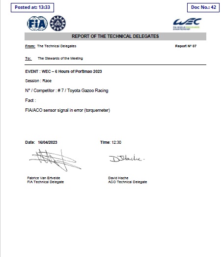 Una falla en uno de los sensores, instalado en el torque trasero emitía datos erróneos ante lo cual la FIA y el organizador de la categoría, Automóvil Club del Oeste (ACO), no podían recopilar el funcionamiento del coche para luego evaluar su performance con respecto a los otros Hypercar.