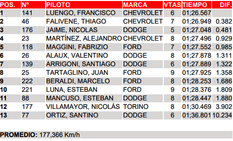 Nicolas Jaime (Dodge), subcampeón 2025 de TC Pista Mouras, se ubicó 3º a 0s481, por delante de Alejandro Martínez. El hermano del “Dibu”, que hace su estreno con Chevrolet y con el Canning Motorsports, quedó a 0s929. El mendocino Fabrizio Maggini (Ford) fue 5º y cerró el lote de pilotos que quedaron a menos de un segundo (0s985).