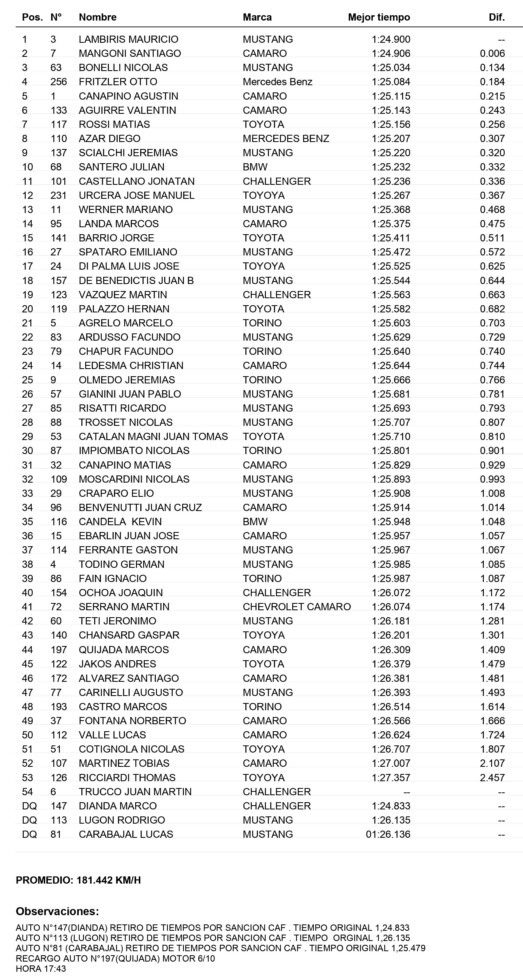 Dianda cortó una racha de 15 clasificaciones sin “pole positions” para Dodge (la anterior había sido de Juan Martín Trucco en El Calafate 2025, también con un Challenger), pero no podrá sacar provecho de ella (sí suma los dos puntos). Esto se debe a que la CAF de la ACTC lo sancionó por una maniobra peligrosa contra Juan José Ebarlín en Final de Centenario y deberá largar último en su serie.