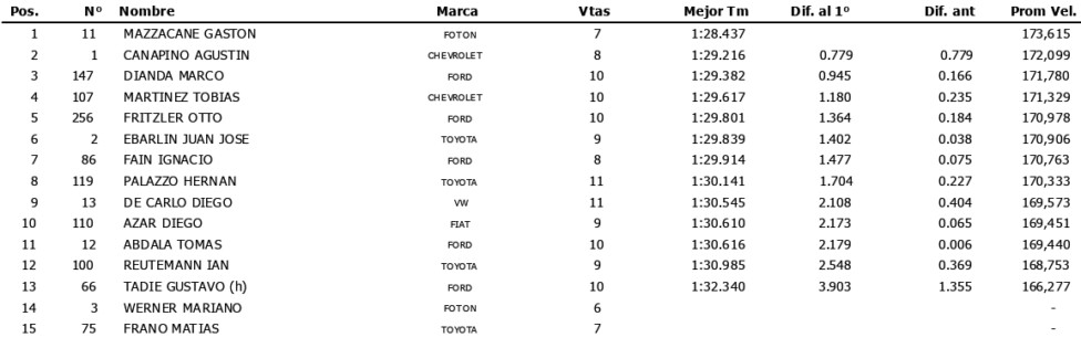 Marco Dianda (Ford Ranger) se quedó con tercer mejor registro, a 0s945 de Mazzacane. Tobías Martínez (Chevrolet S10) fue 4º a 1s180, mientras que Otto Fritzler (Ford Ranger), líder del campeonato y último ganador del TC Pick Up, cerró el grupo de los 5 más rápidos, a 1s364.