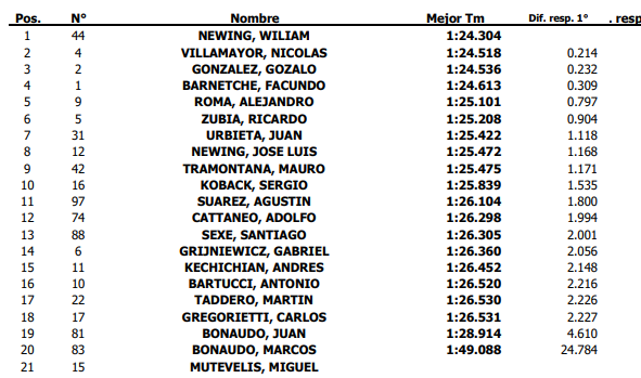 Nicolás Villamayor, con el Ford, culminó en la segunda colocación a 0s214 del líder mientras que Gonzalo González, con el Chevrolet, completó los primeros tres clasificados a 0s232 de la punta.