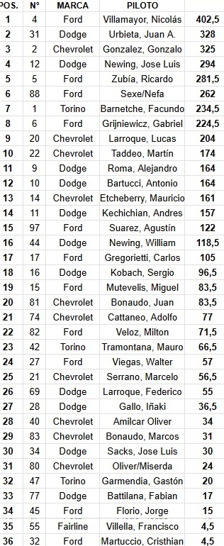 José Luis Newing (Dodge), que perdió rendimiento sobre el final por el desgaste que sufrieron los neumáticos de lluvia, terminó 2º a 2s420 y cosechó su 4º podio de la temporada. Por su parte, Agustín Suárez (Ford), otro piloto que tiene motores preparados por su padre, protagonizó un destacado avance desde el 10º puesto de largada hasta la 3ª posición, lo que le valió su primer “top 3” del año en su despedida del Falcon, ya que el próximo año correrá con una Chevy.
