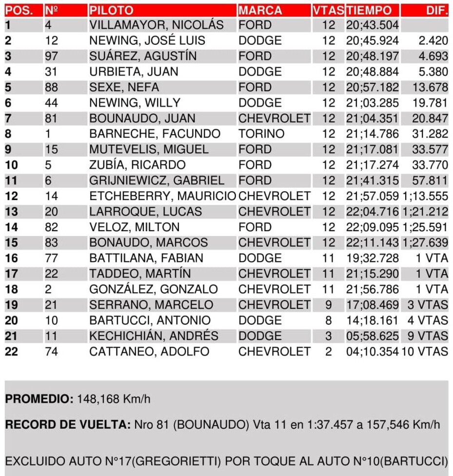 La lucha directa duró poco, ya que en afán por superar al líder González pisó un pianito en la 4ª vuelta y perdió el control de la Chevy, que terminó despistada en el pasto. Volvió a la pista en el 9º puesto, aunque en el 8º giro sufrió la rotura del neumático delantero izquierdo, lo que sentenció sus posibilidades de ser campeón (tras pasar por los boxes terminó 19º). En cambio, Villamayor se dio el gusto de lograr su 4ª victoria del año luego de superar a Newing en la última vuelta.