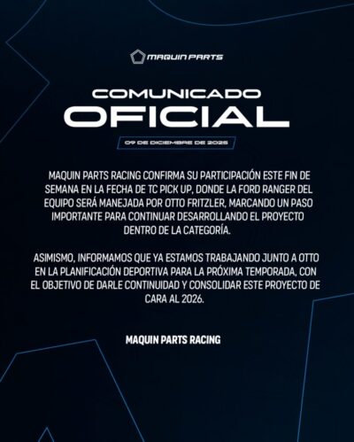 El Maquin Parts Racing anunció a través de sus redes sociales la participación de Otto Fritzler en la última fecha que las TC Pick Up llevarán adelante el próximo 14 de diciembre en el «Autódromo Roberto Mouras» de La Plata.