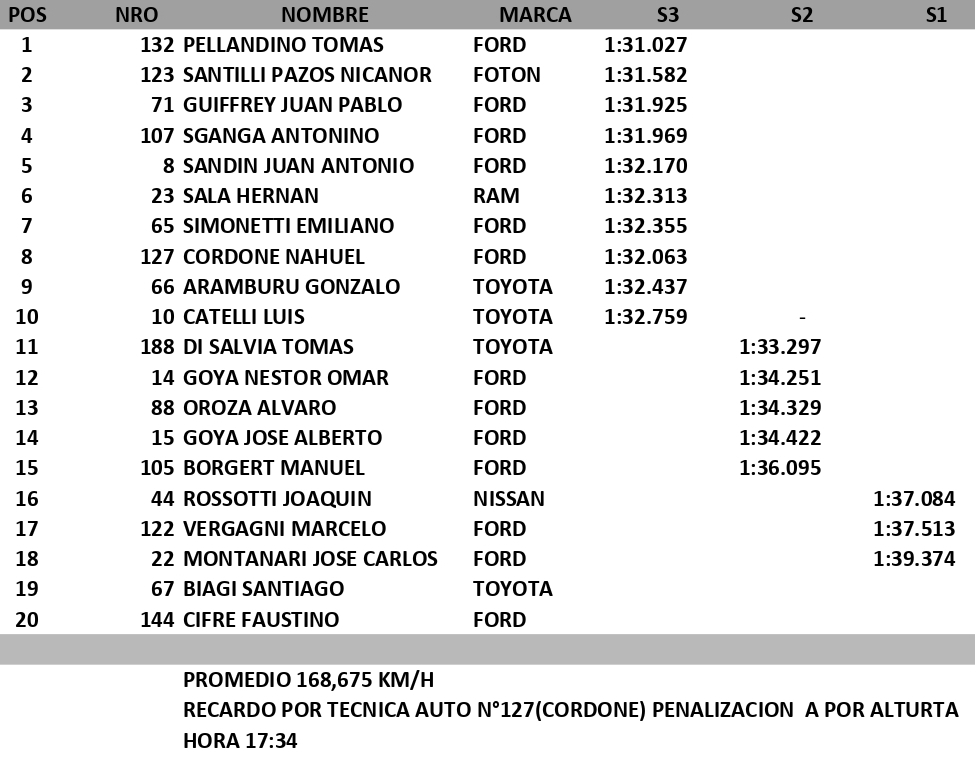 El entrerriano del SAP Team, que también había logrado la “pole” en el Coronación 2025, dominó cada uno de los tres cortes clasificatorios y en cada una de ellos estableció una diferencia superior a las dos décimas respecto de su escolta. En la 3ª y decisiva instancia clasificatoria, Pellandino marcó 1m31s027 y postergó a Nicanor Santilli Pazos (Foton Tunland G7) por 0s555.