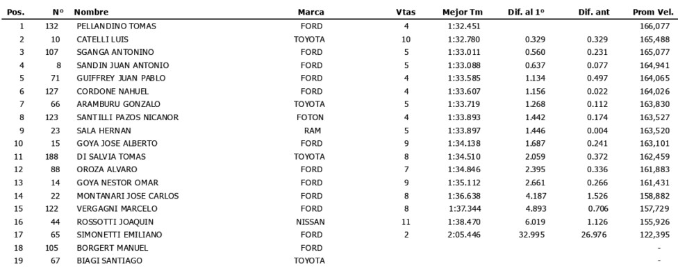 El piloto del SAP Team superó por 0s329 a Luis Catelli (Toyota Hilux). Otros tres representantes del “Óvalo” completaron el grupo de los 5 más rápidos: Antonino Sganga, a 0s560; Juan Antonio Sandín, a 0s637 y Juan Pablo Guiffrey, a 1s134.