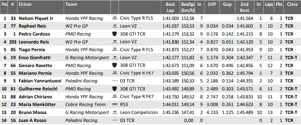 Aún llevando un lastre hándicap de 40 kilos, el coche de Piquet Jr. demostró una sólida performance que le permitió superar al Cupra de Raphael Reis por 34/1000 y al Peugeot de Pedro Cardoso por 0s176; la cuarta posición la ocupó Leonardo Reis (Cupra) a 0s827, seguido por Tiago Pernía (Honda), que se ubicó en el quinto puesto a 0s870.