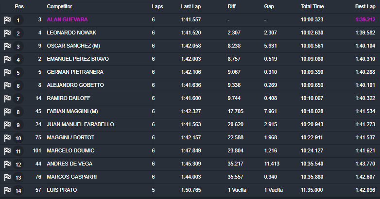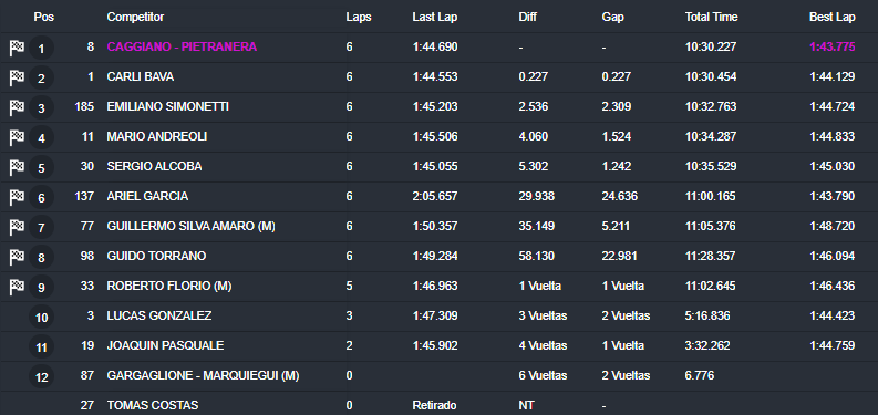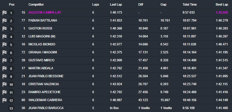 El de Bragado, que había hecho la «pole» unas horas antes, se adjudicó lo que resultó el más lento de los dos parciales. Completó las seis vueltas de disputa en 10m00s323, aventajando así por 2s307 a Leonardo Nowak (Chevrolet), mientras que el chaqueño Oscar Sánchez (Ford) completó las tres primeras posiciones.