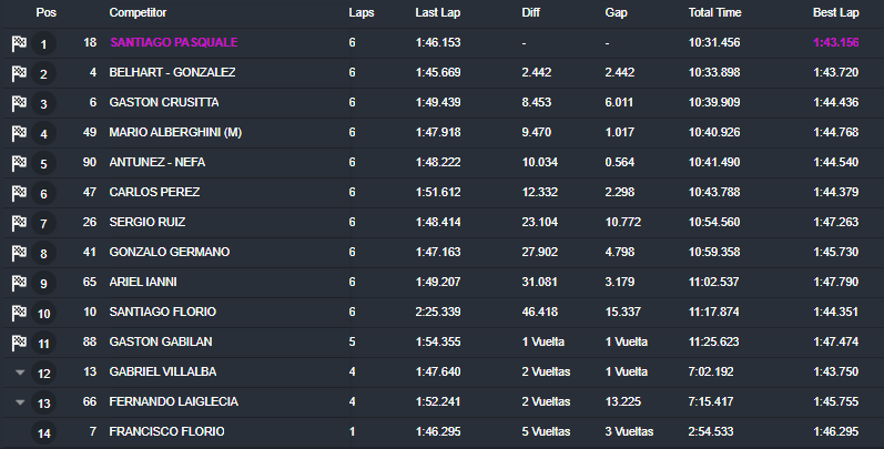 En la Clase «B», el autor de la «pole position» también cambió el «1» por serie. El baraderense Santiago Pasquale (Chevrolet) prevaleció con autoridad y estiró a más de dos segundos la ventaja sobre Guillermo Belhart (Chevrolet). Más atrás figuró el experimentado Gastón Crusitta (Ford), en el tercer puesto y a 8s453 de la referencia.