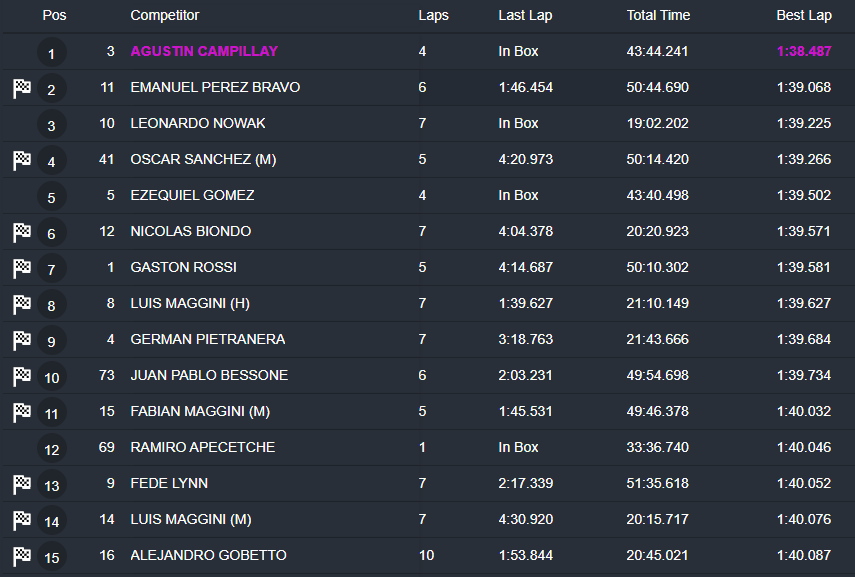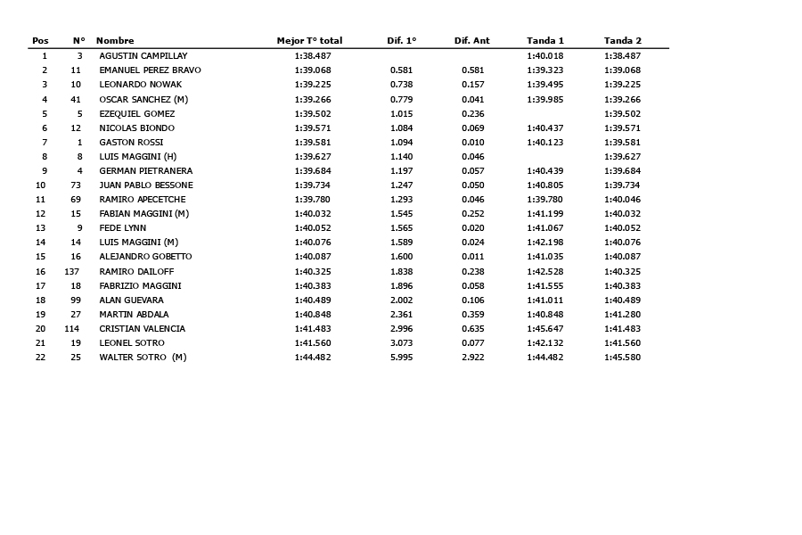Por su parte, Agustín Campillay se adjudicó la segunda tanda que se disputó por la tarde con un tiempo de 1m38s487 y 4 vueltas dadas al trazado platense. El piloto de Dodge fue escoltado por Emmanuel Pérez Bravo y Leonardo Nowak
