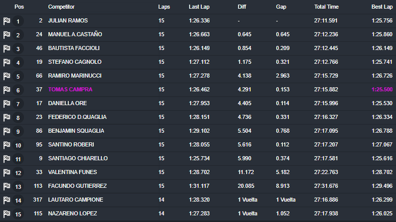 De esta forma, Ramos obtiene un importante triunfo que le permite mantenerse como puntero del campeonato a falta de dos competencias para el cierre de la temporada. Manuel Álvarez Castaño finalizó en segundo lugar, mientras que Bautista Faccioli completó el podio.