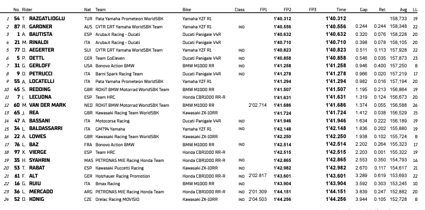 Tras una primera sesión de entrenamientos libres del World Superbike caracterizada por la lluvia y con sólo cuatro pilotos en pista (Liderada por Leandro «Tati» Mercado), volvió la normalidad en los FP2 del Gran Premio de España y el mejor tiempo lo marcó Toprak Razgatlioglu (1m40s312), quedando por delante de su compañero Remi Gardner (+0s244).
