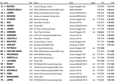 En la segunda práctica, los roles se invirtieron: el italiano superó por 0.232 segundos al turco y en promedio de velocidad de ambas pruebas, terminó por encima de Razgatlioglu. Además, fue el único en bajar el tiempo de 1.36 segundos por vuelta.