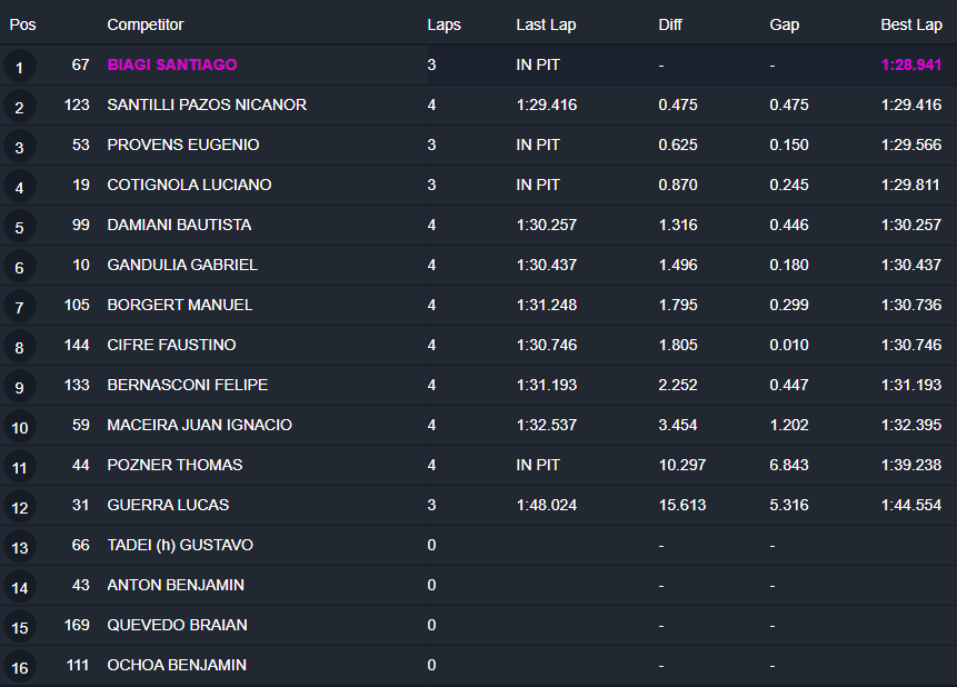 Biagi giró en el primer cuarto, el único que giró con la pista seca. El segundo cuarto que salió a clasificar sufrió con la aparición de la lluvia, lo que hizo que varios autos se despistaran (Tadei, Antón y Quevedo) al momento de abrir la vuelta rápida y determinó que saliera la bandera roja, por lo que se quedaron sin tiempos. Y el tercer cuarto -el de los pilotos con mejor ranking- giró en condiciones similares al segundo.