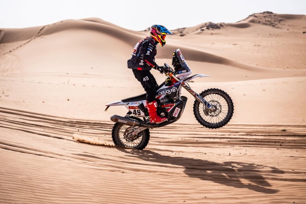 La travesía es dura y reclama principal atención en el cuidado de su moto KTM: «Estamos muy bien, positivos y la moto viene impecable; hoy toca cambiar las dos ruedas. El mantenimiento general ya se hizo todo ayer en el día de descanso, así que hoy es solo repaso y a seguir para mañana».